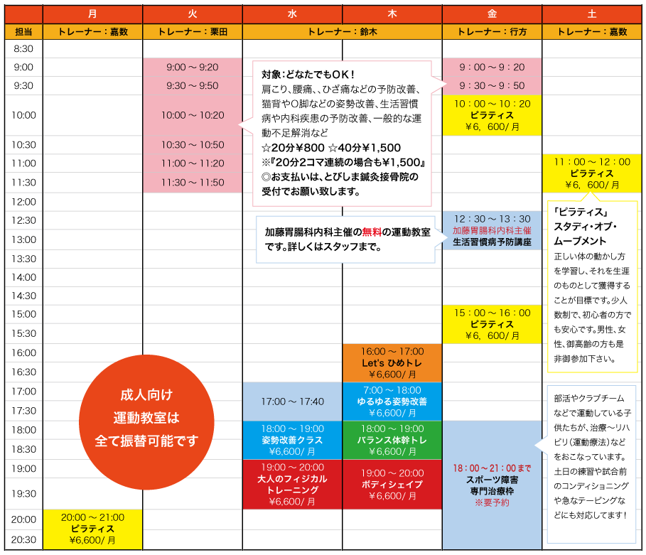 とびしまトレーニングセンターOne-Stepでは、運動教室をはじめとした健康維持、痛みの予防、体力づくりを目的とした教室を開催しております。