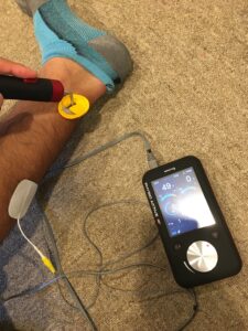 この機器の良いところは少ない皮膚抵抗(ピリピリ感が少ない)で、深部の組織(筋肉)へ効果的な刺激をあたえてコリや、痛みをやわらげます。
